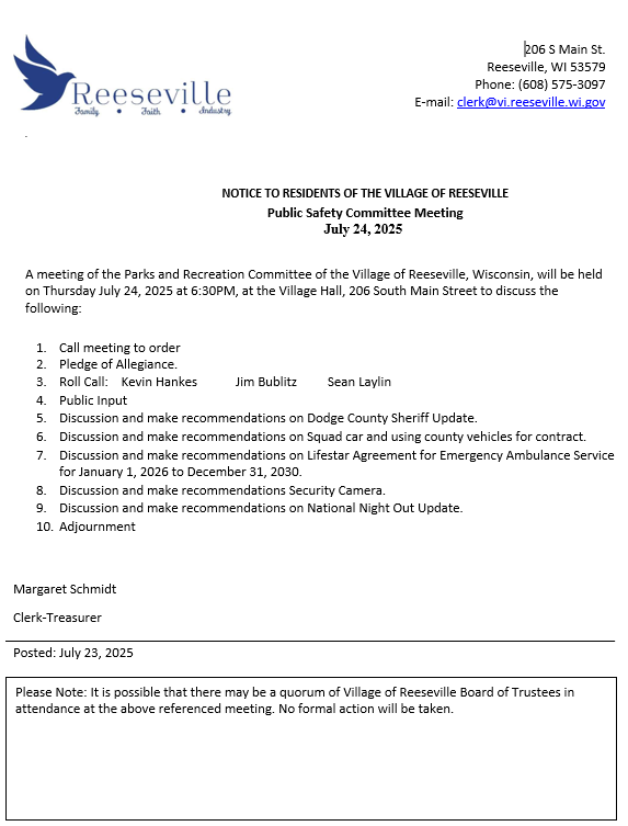 NOTICE TO RESIDENTS OF THE VILLAGE OF REESEVILLEREGULAR VILLAGE BOARD MEETINGA regular meeting of the Village Board of Reeseville, WI will be held on Thursday December 11, 2025 at 6:30 p.m. at the Reeseville Village Hall located at 206 South Main Street. December-2025-agenda-village-board-V.pdf