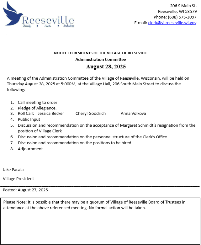 A meeting of the Administration Committee of the Village of Reeseville, Wisconsin, will be held on Thursday August 28, 2025 at 5:00PM, at the Village Hall, 206 South Main Street