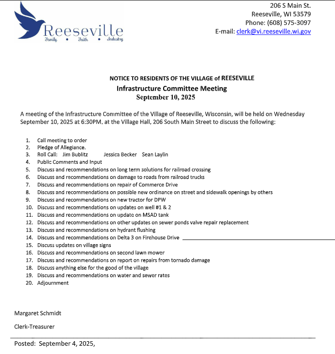 A meeting of the Infrastructure Committee of the Village of Reeseville, Wisconsin, will be held on Wednesday