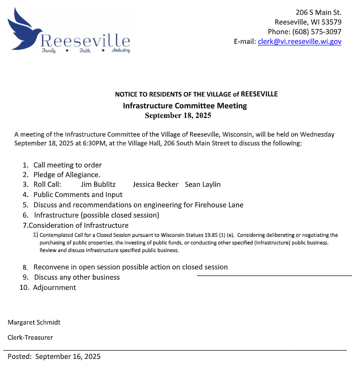 A meeting of the Infrastructure Committee of the Village of Reeseville, Wisconsin, will be held on Wednesday