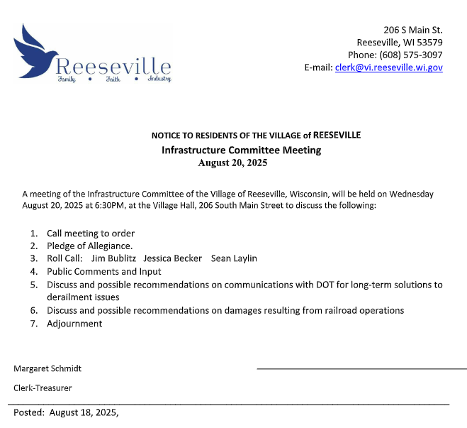 A meeting of the Infrastructure Committee of the Village of Reeseville, Wisconsin, will be held on Wednesday