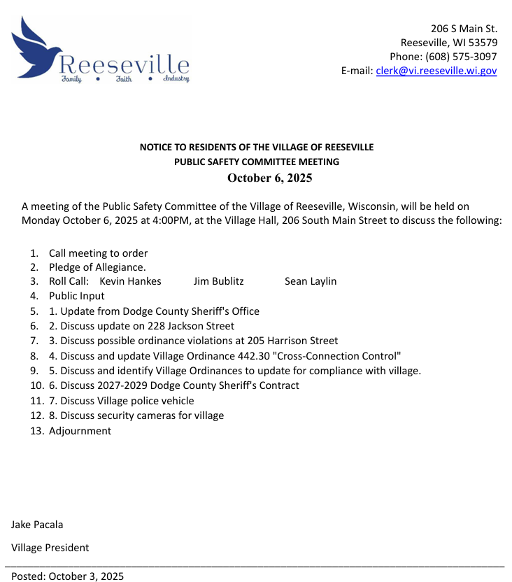 A meeting of the Public Safety Committee of the Village of Reeseville, Wisconsin, will be held on